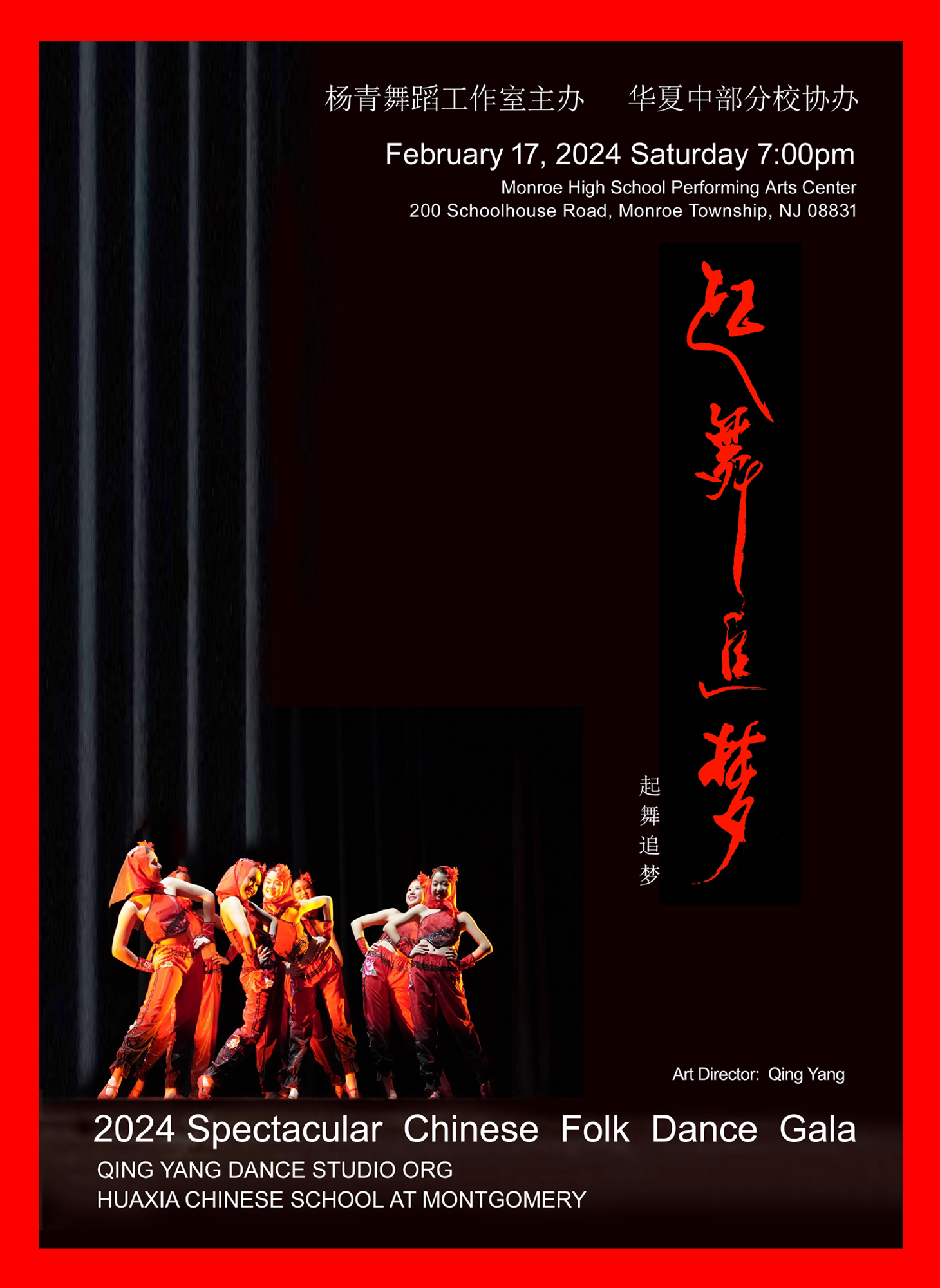 新泽西杨青舞蹈艺术团, 华夏中文学校(中部分校)联合举办 第八届中国民族舞蹈专场:《起舞追梦》 February 17, 2024, Monroe HS Performing Arts Center, Monroe Township, NJ 08831