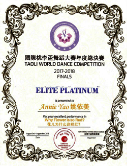 获2018国际桃李杯纽约赛区 “十佳铂金”、 Elite Platinum