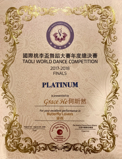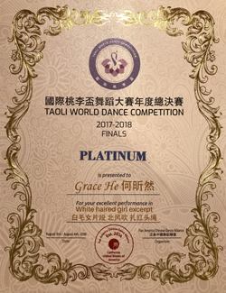 2016-17海外桃李杯国际舞蹈大赛(16-18年龄组)获铂金, 第一名和评委最高荣誉奖和最高技巧奖(美国波士顿,